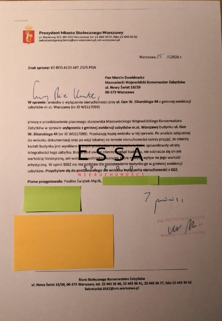 Na działce wybudowany jest budynek mieszkalny wolnostojący. W związku z tym, że nieruchomość jest wpisana do GEZ złożony został wniosek o jego wyłączenie. Aktualnie jest wystawiona opinia Prezydenta Miasta Stołecznego Warszawy z którego wynika, że nie ma podstaw do pozostawienia go w gminnej ewidencji zabytków.
